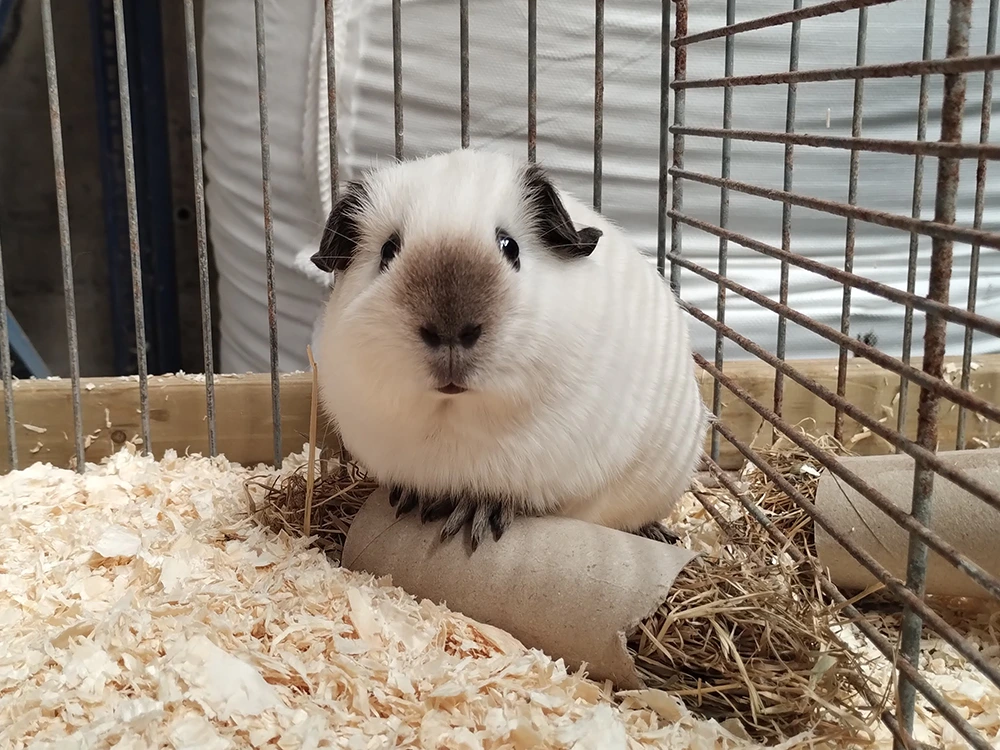 Alle dieren hadden een eigen, ruime kooi met voldoende zaagsel, vers hooi, water en brokjes. Lollypop vond het rolletje met hooi wel leuk om bovenop te staan.